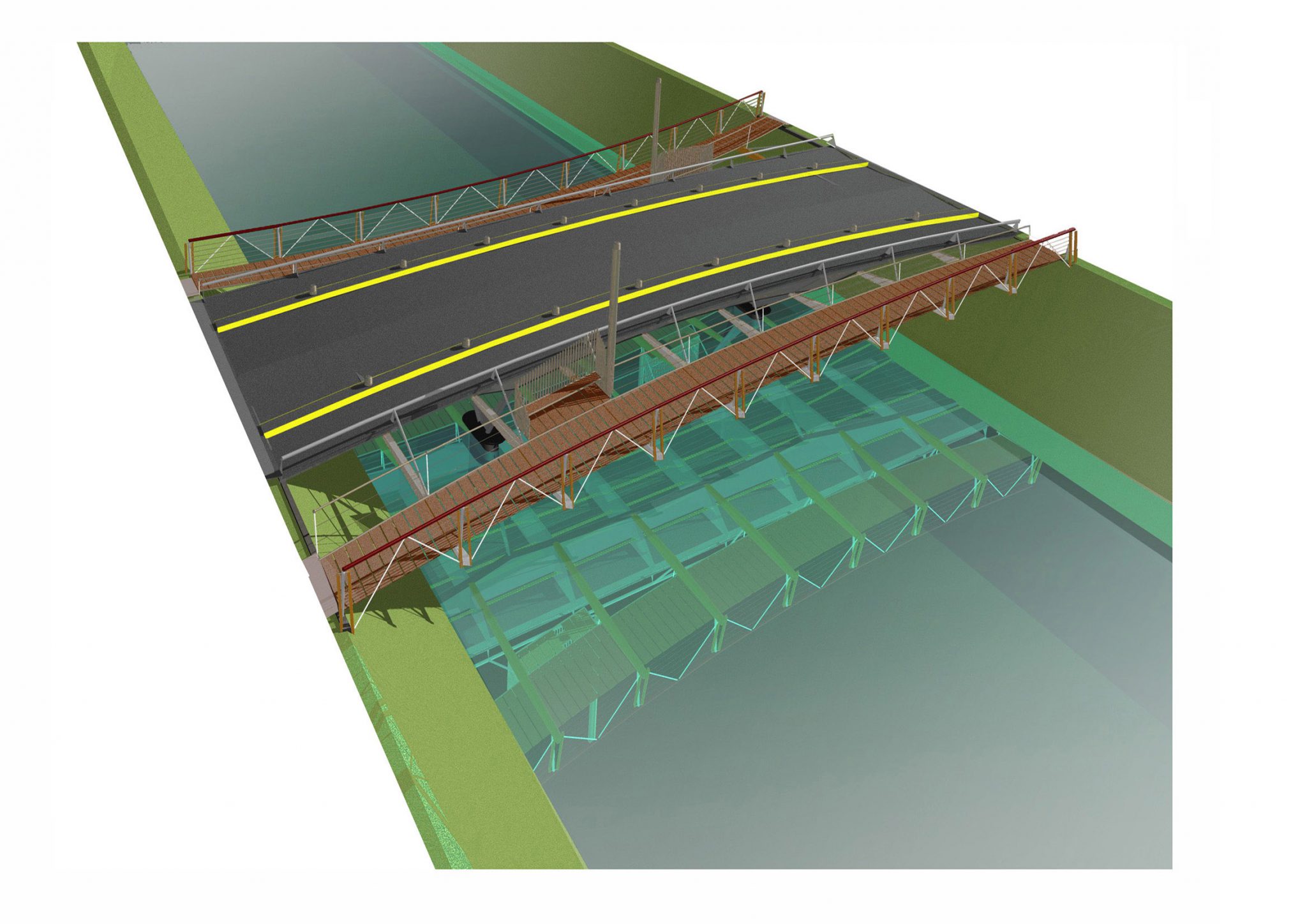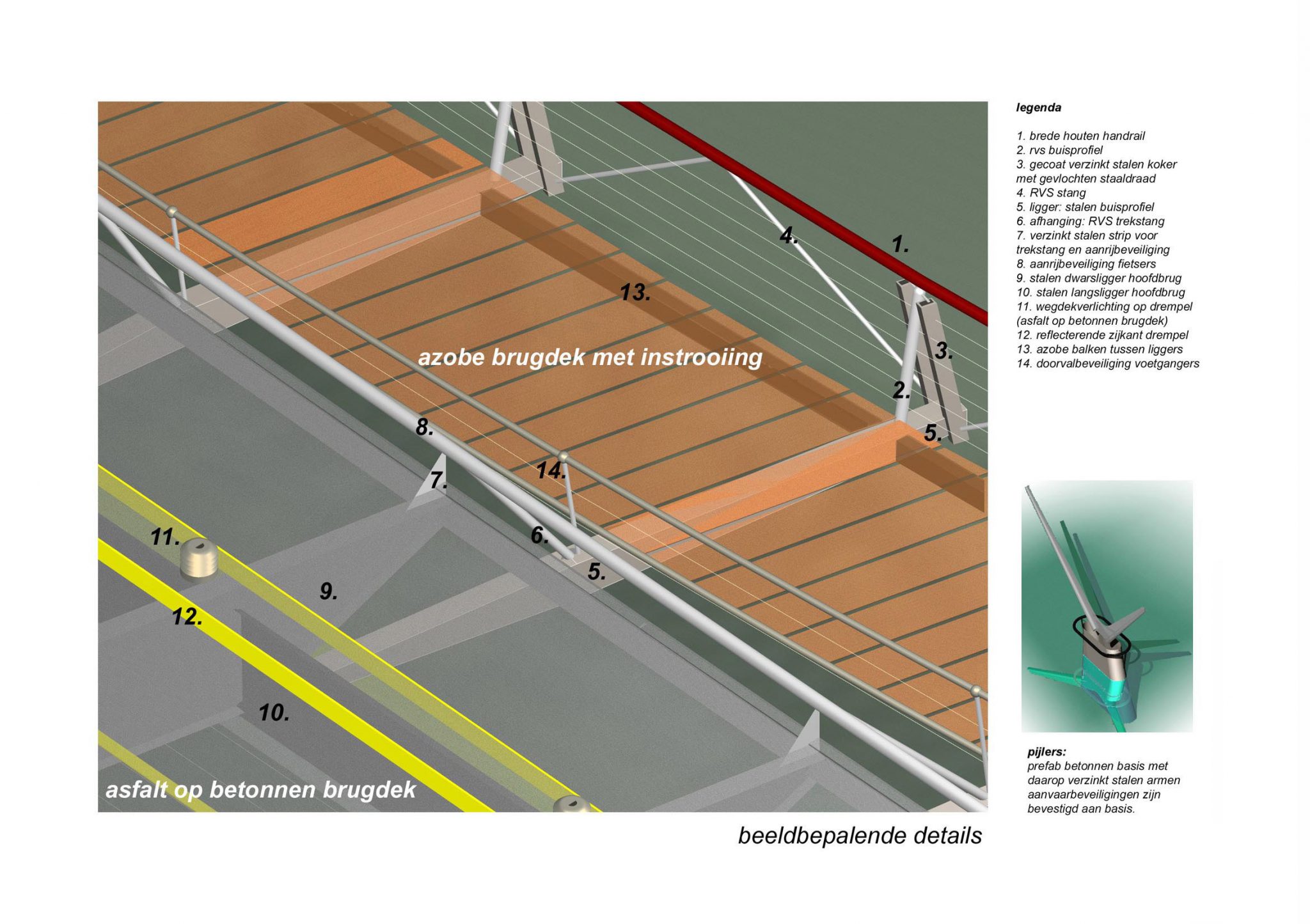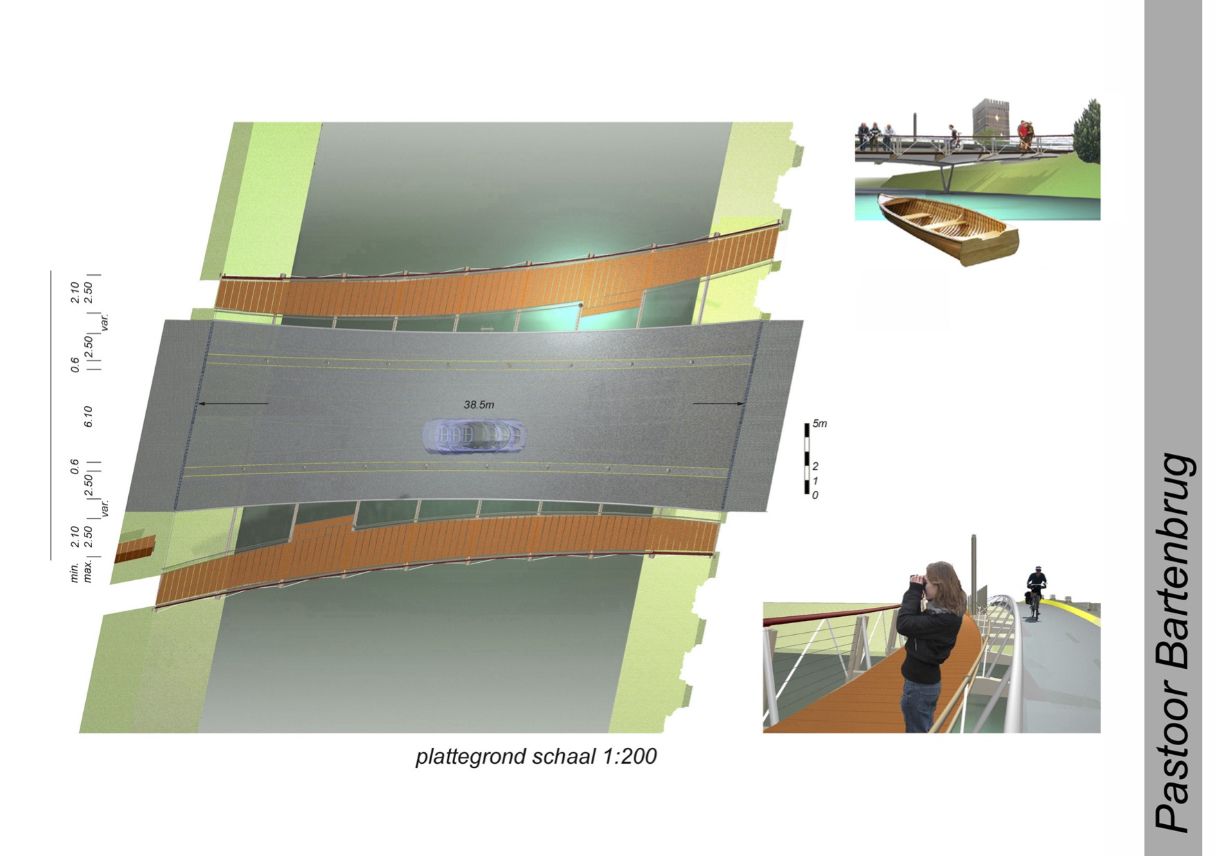 Dit brugontwerp was een prijsvraaginzending voor de vervanging van de Bartenbrug en legt verbinding tussen beide oevers, waarbij de voetgangers en fietsers op een speelse manier worden gescheiden van het gemotoriseerd verkeer, dat een zwaardere brugconstructie nodig heeft dan het langzame verkeer.